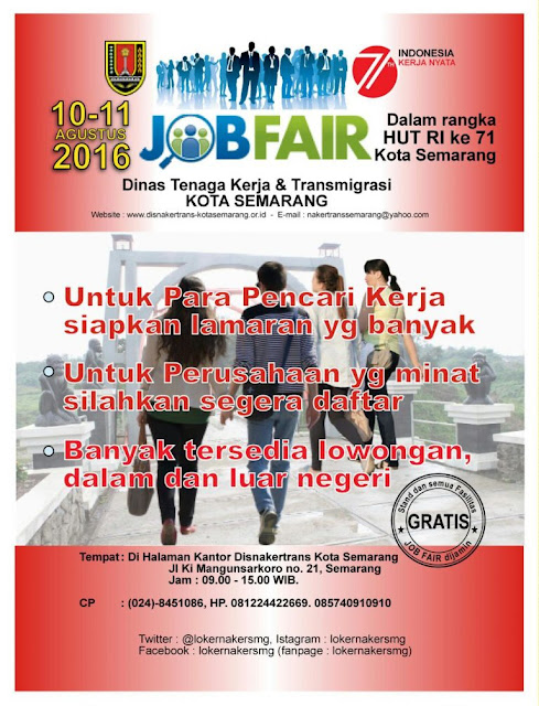 Buat kalian yang sedang pusing cari kerja, datang saja ke Job Fair Dinas Tenaga Kerja dan Transmigrasi Kota Semarang yang diselenggarakan dalam Rangka HUT RI ke 71. Bursa kerja ini akan dilaksanakan pada tanggal 10 hingga 11 Agustus 2016 di Halaman Kantor Dinas Tenaga Kerja dan Transmigrasi Kota Semarang.